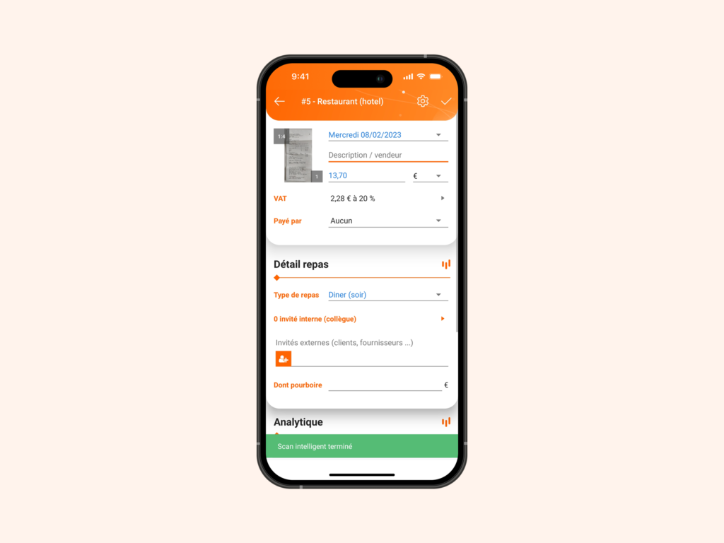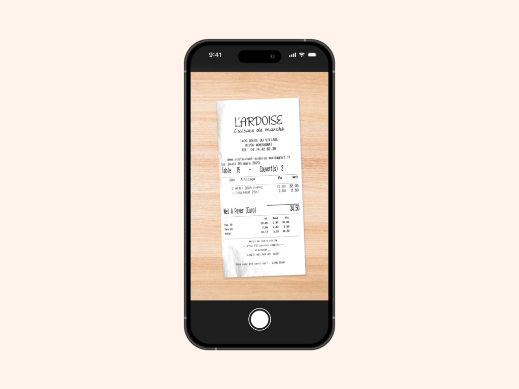 Prenez en photo un reçu depuis l’application mobile ou transférez-le depuis un e-mail (Uber, SNCF, Booking, etc.). Aucune action supplémentaire n’est requise.